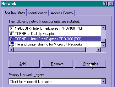 เลือกที่รายการ TCP/IP -> การ์ดเน็ตเวิร์ค เลือก Properties หรือ ดับเบิ้ลคลิกที่รายการ TCP/IP -> การ์ดเน็ตเวิร์ค