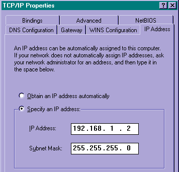 ที่แท็บ IP Address เลือก Specify an IP address ในช่อง IP Address ป้อนหมายเลข IP ชั้น Private เช่น 192.168.1.2 (หมายเลข IP ถัดจากเครื่องแม่ข่าย) หากมีหลายๆ เครื่องก็ตั้งเพิ่มเป็น 192.168.1.3, 192.168.1.4 ไปเรื่อยๆ ห้ามตั้งซ้ำกัน Subnet Mask ป้อนหมายเลข 255.255.255.0 หมายเลข Subnet Mask นี้ต้องเหมือนกันทุกเครื่อง (หรือจำง่ายๆ IP Address ห้ามซ้ำกัน แต่ Subnet Mask ต้องเหมือนกัน)