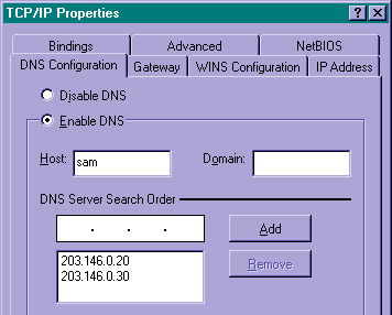 คลิกแท็บ DNS Configuration เลือก Enable DNS ในช่อง Host ให้ป้อนชื่อเครื่องคอมพิวเตอร์ที่คุณใช้อยู่ (สำหรับชื่อเครื่องคอมพิวเตอร์นั้น สามารถดูได้จากการคลิกขวาที่ไอค่อน Network Neighborhood เลือก Properties คลิกที่แท็บ Identification แล้วดูชื่อจากช่อง Computer name) ในช่อง DNS Server Search Order ให้ป้อนหมายเลข DNS ของ ISP ที่คุณใช้บริการอยู่ แล้วกดปุ่ม Add หากไม่ทราบหมายเลข DNS ให้สอบถามกับ ISP หรือป้อนหมายเลข IP ของเครื่องแม่ข่าย (เครื่องที่รัน WinRoute) หากเปิด WinRoute เป็น DNS Forwarder