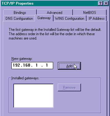 คลิกแท็บ Gateway ป้อนหมายเลข IP ของเครื่องแม่ข่ายในช่อง New gateway แล้วกดปุ่ม Add (เลขที่ป้อนนี้นิยมเรียกกันว่า default gateway ซึ่งก็คือหมายเลข IP ของการ์ดเน็ตเวิร์คของเครื่องแม่ข่ายที่เชื่อมโยงไปในเครือข่าย)